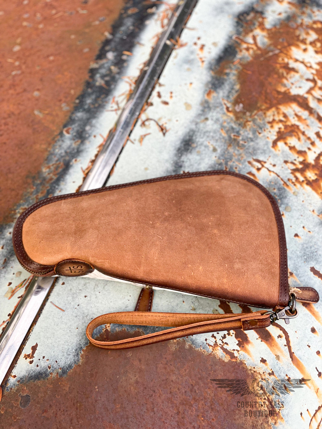 This adorable cowhide pistol case has cowhide on the front and is distressed leather on the back.  It has a zip pocket on the front and zip closure.  The inside is cloth and padded with 2 slip pockets.  It also has a removable wrist carrying strap.