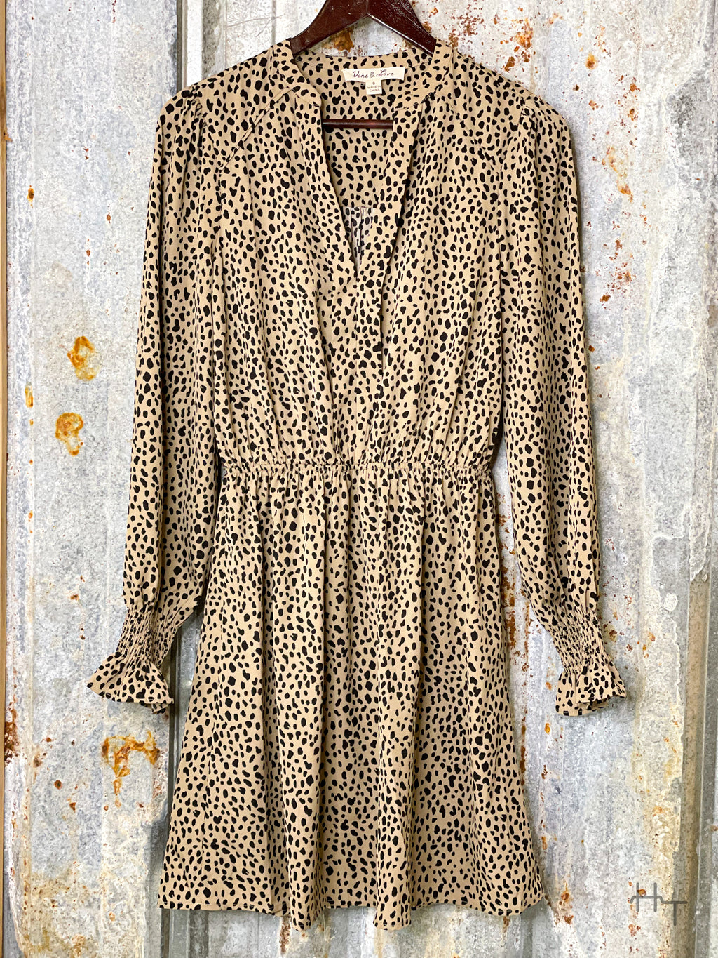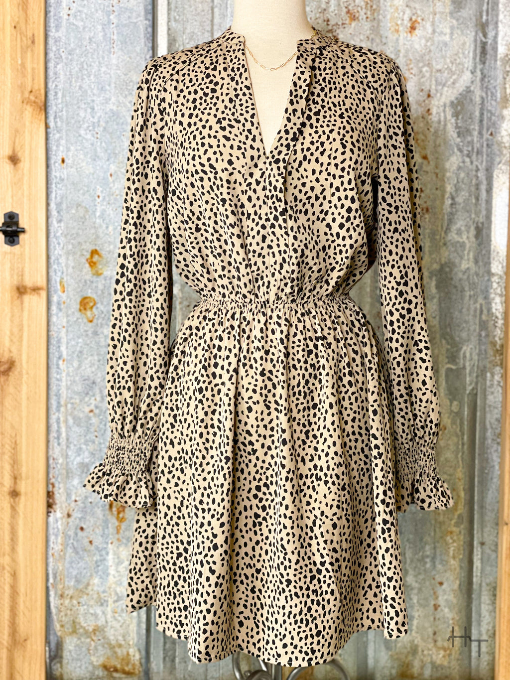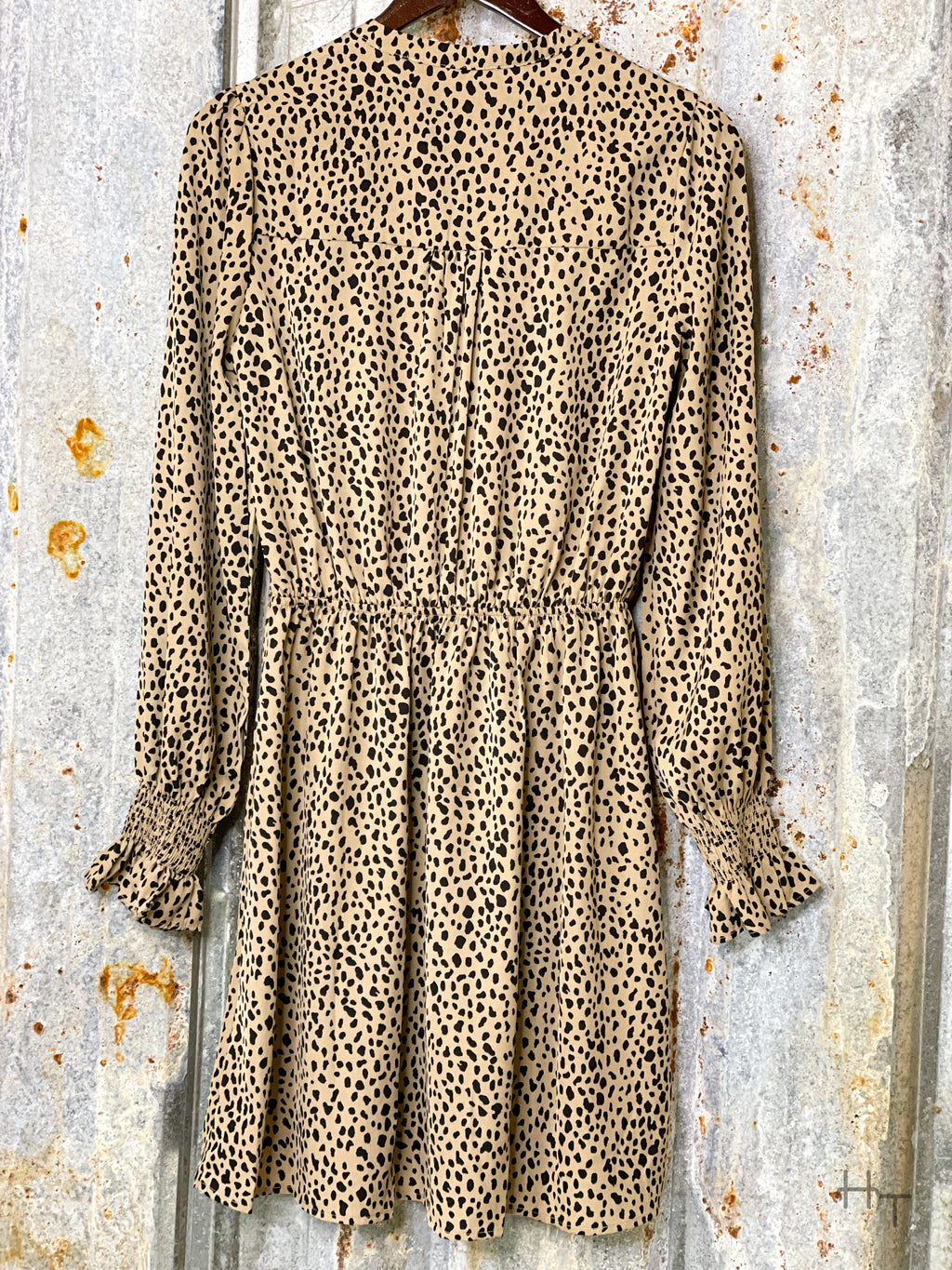 If you are looking for the perfect little long sleeve dress for work, special events, or just because, you will love this Latte Spotted Dress. It a light latte brown with black spots. This dress features a V cut neck line, elastic cuffs with ruffle at the end, and an elastic waist band.
