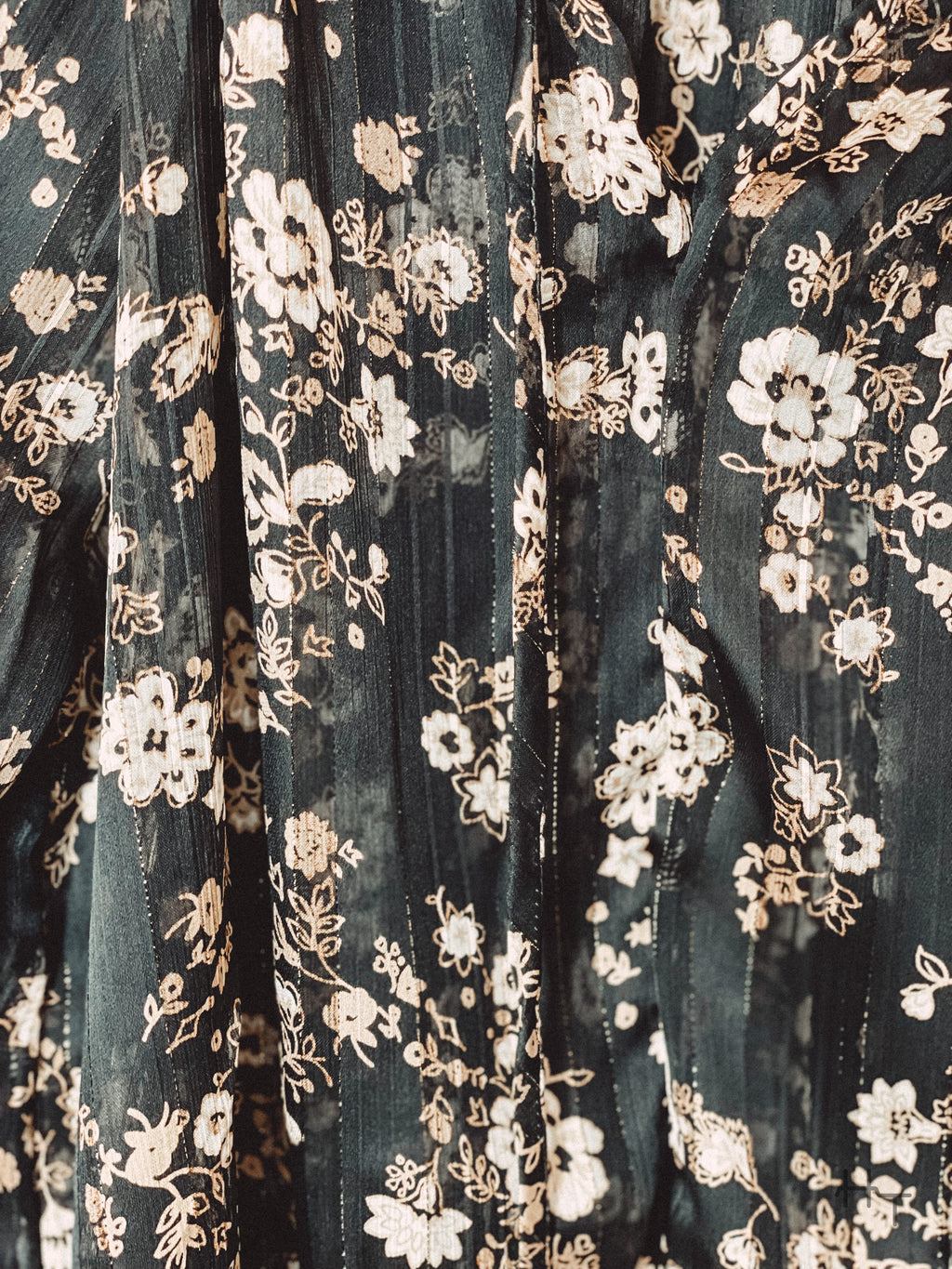 + Black chiffon material with cream and tan floral print and subtle black vertical pin striping with hints of metallic gold woven in.