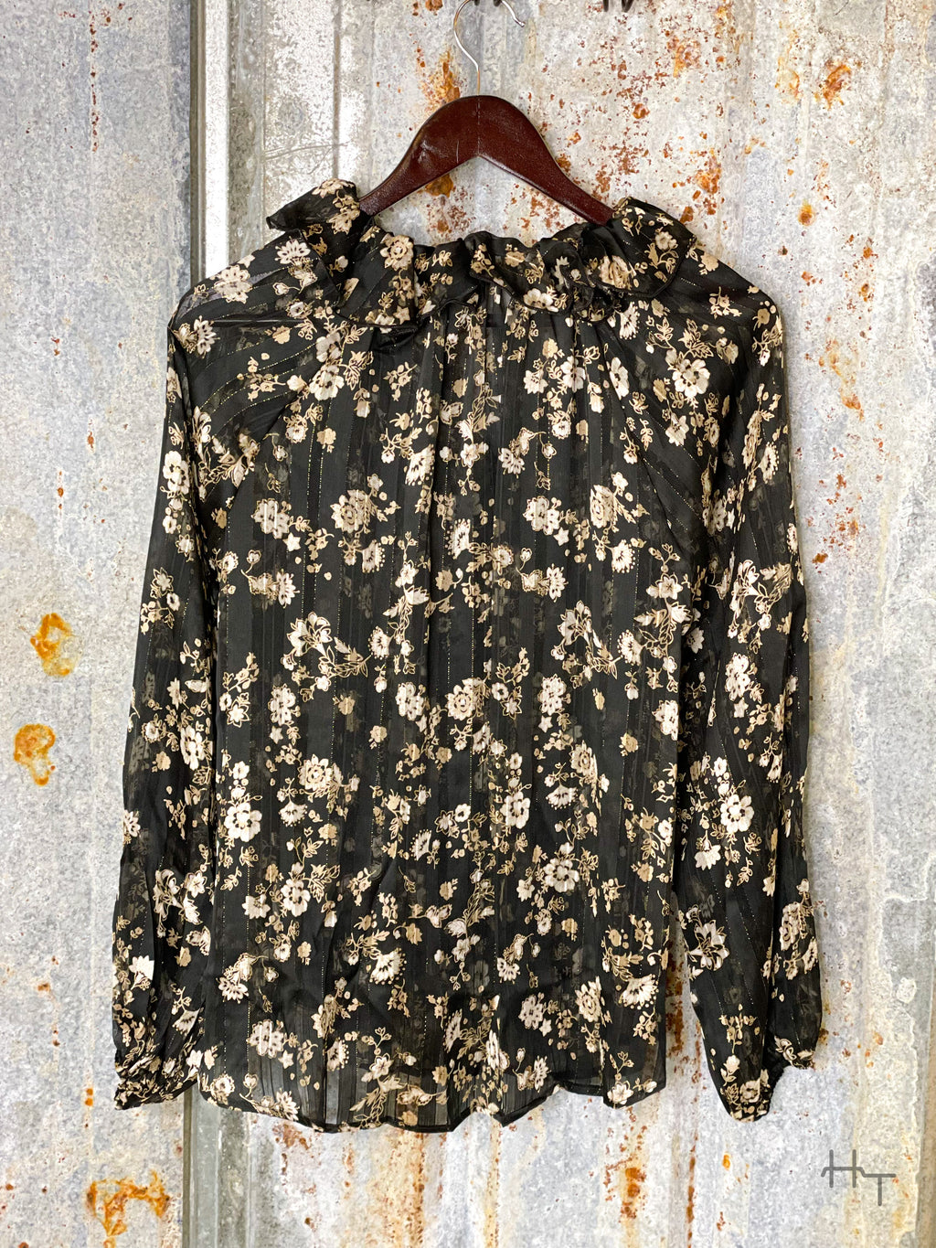 This black floral print chiffon long sleeve top is perfect for work days and nights out. It has beautiful cream and tan floral print design with back and metallic gold pin striping. This top looks fancy, but it is comfortable and easy to move around in.
