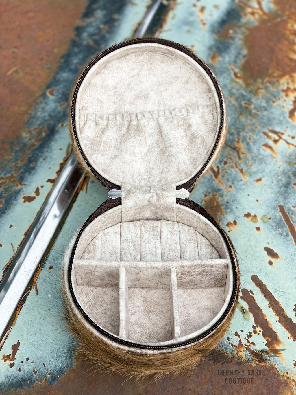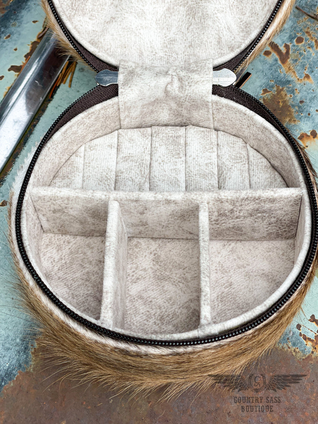 Keep your jewelry safe and organized when you travel with these cute and handy jewelry cases.  The exterior is tooled leather on the top and cowhide on the side with a zipper closure.  The interior has 3 divided compartments, 6 ring holders, and a pocket on the lid.