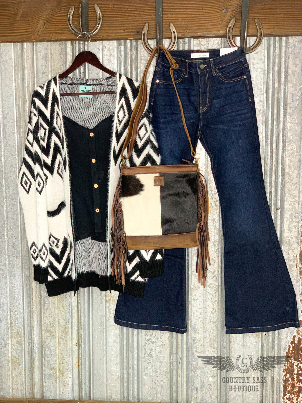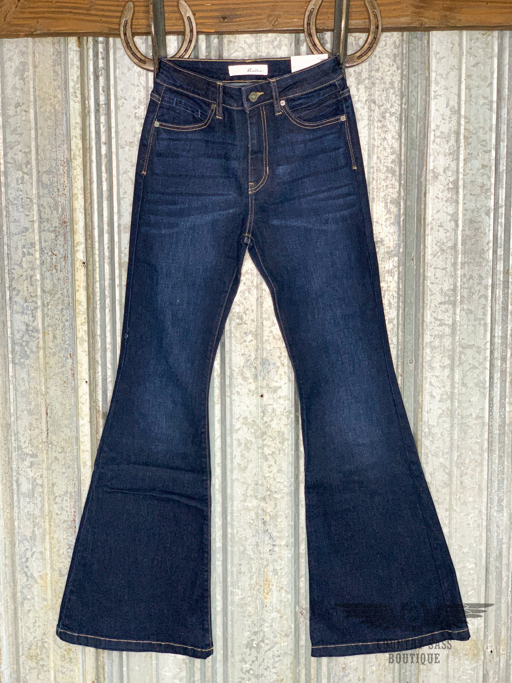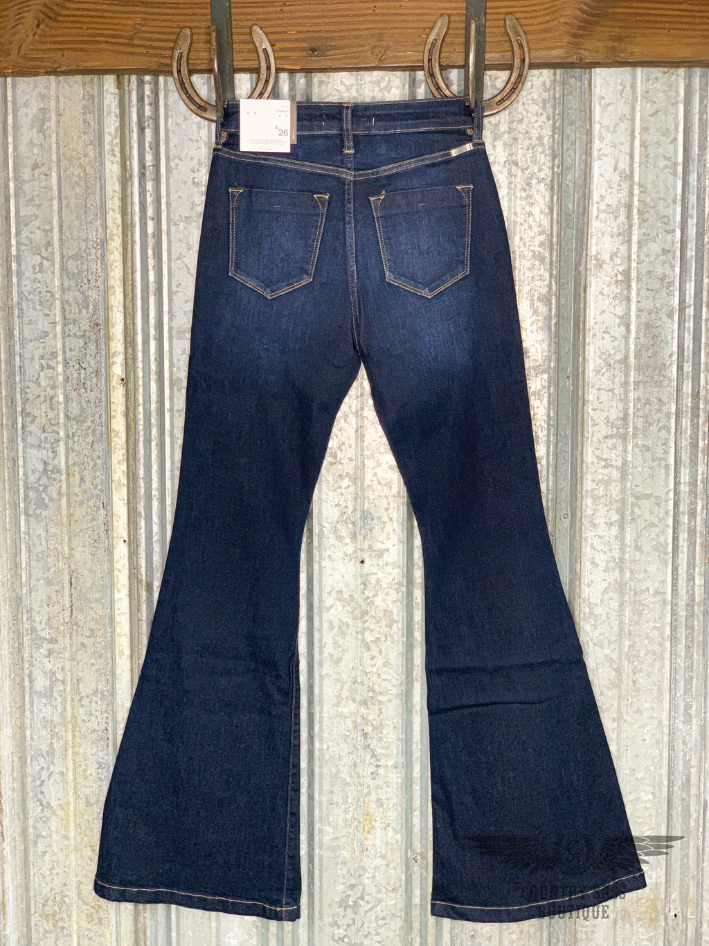 These dark wash Zoe denim jeans feature a super high rise waist and an extra wide flare leg.