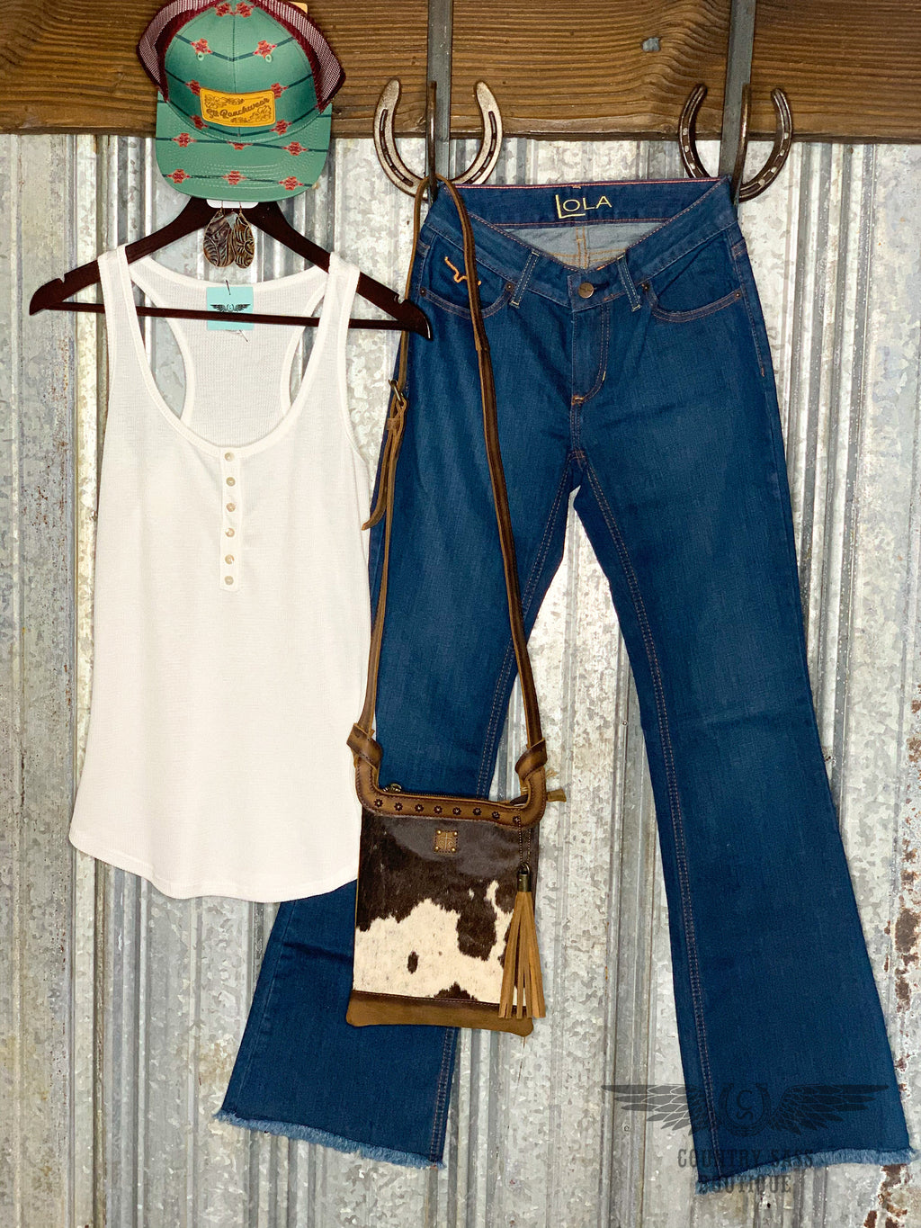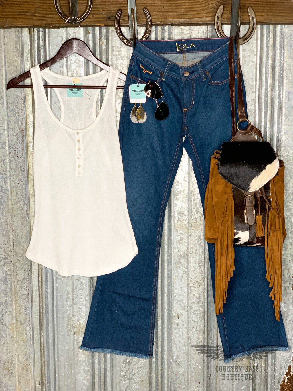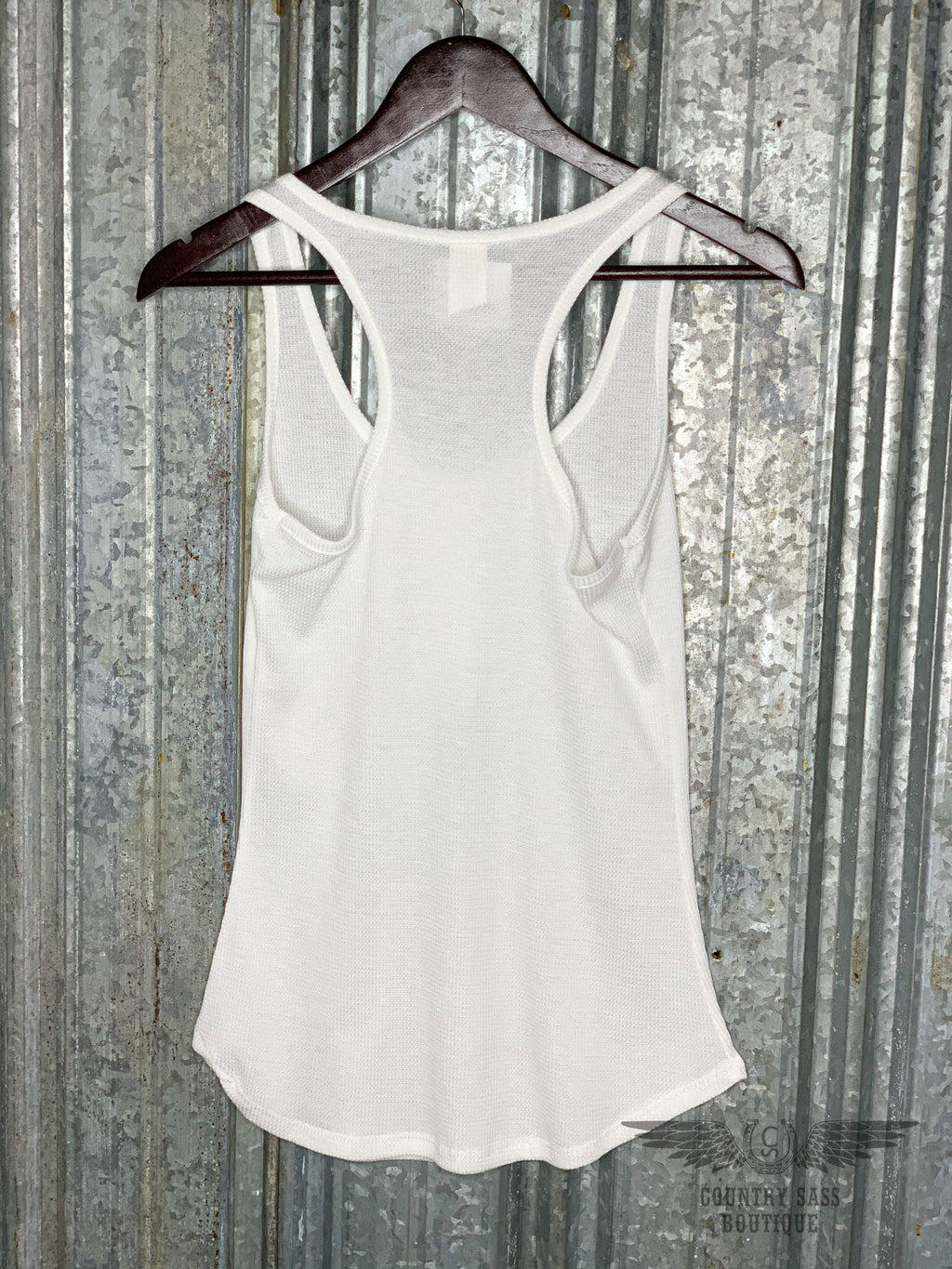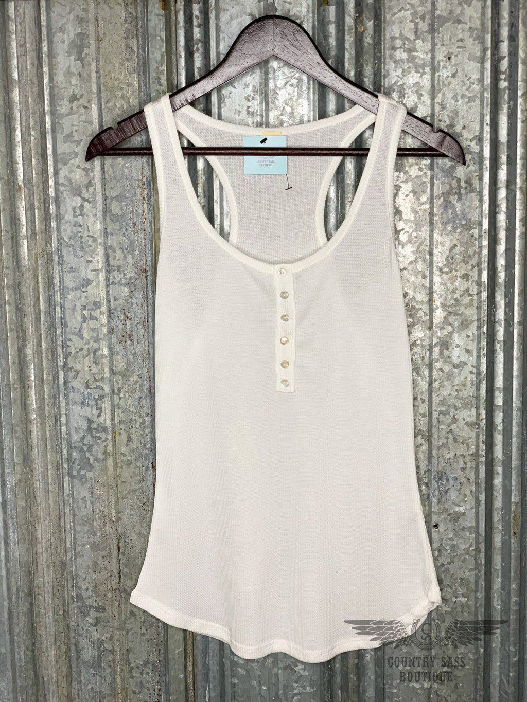 The Heather tank is going to be you new favorite that you will want in every color!! It is made with a small waffle knit fabric that perfectly hugs your body. It is a razor back style tank with petite buttons part way down the front.