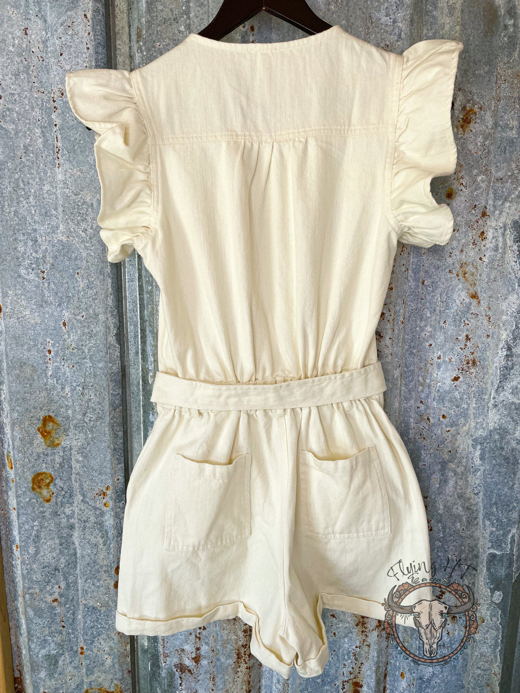 Experience the ultimate comfort and style with our Cream Ruffle Sleeve Denim Romper! The cream-colored denim shorts provide a modern twist to a classic look, while the ruffle sleeves add a touch of femininity. The button front and belt accentuate your figure for a flattering fit. Elevate your wardrobe with this must-have piece!