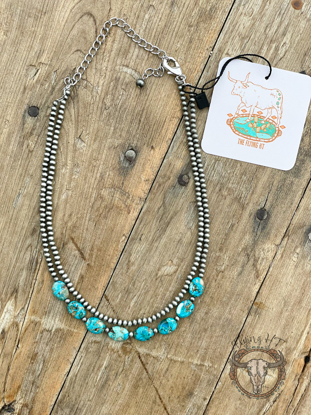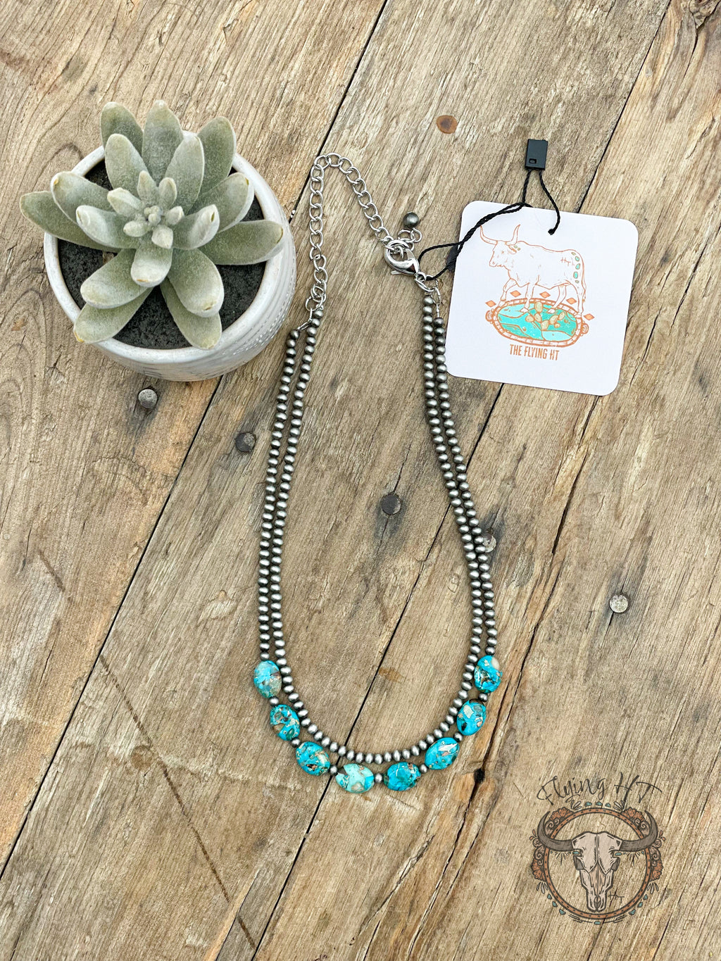 Make a statement with Monica, our double-stranded Navajo pearl necklace! Show off your style with an outer strand of oval turquoise beads, then adjust to your perfect length. Whether you're out on the town or just chillin' at home, Monica will always be the perfect accessory.