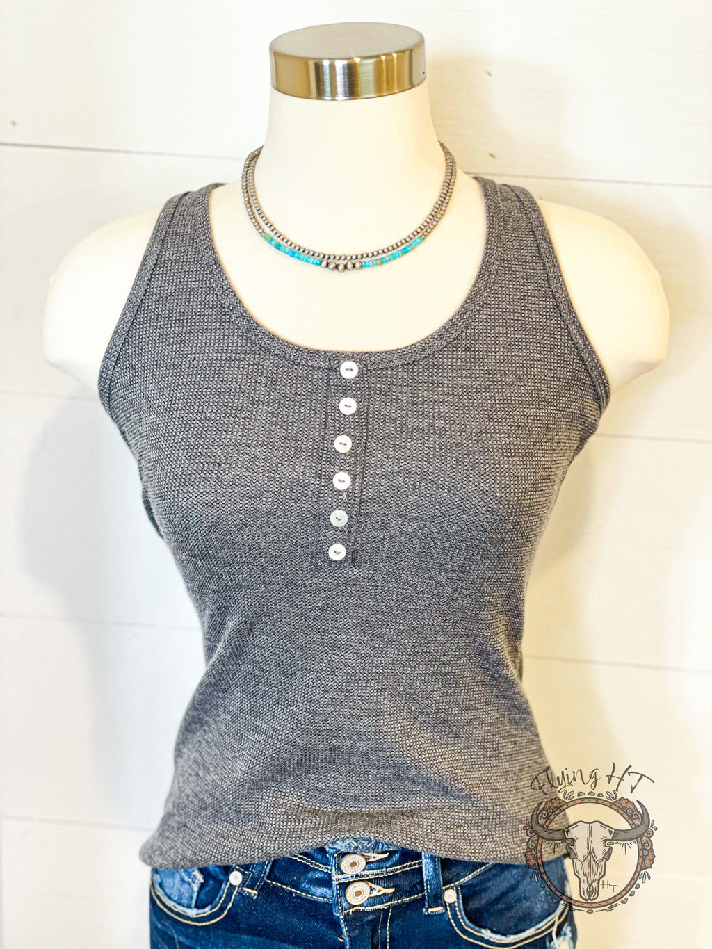Experience fashion-forward confidence with The Beck Tank Top. Its vintage grey color is sure to make you stand out, while the henley material, partial button front, and crochet racerback detail make this tank top the perfect addition to any daring look. Embrace your fearless style with The Beck Tank Top!