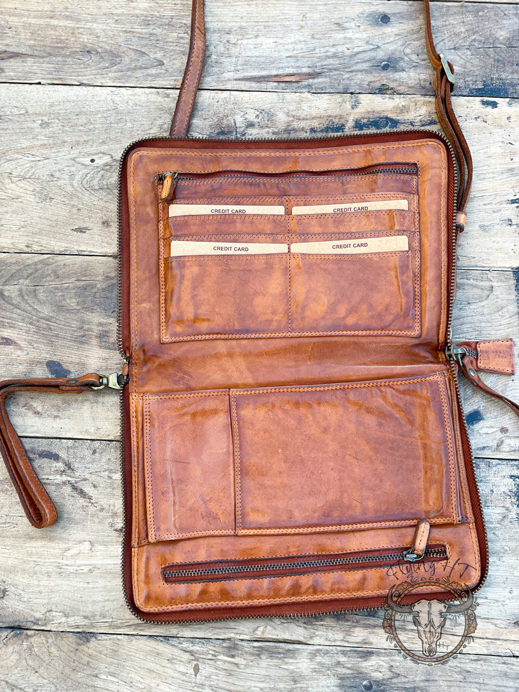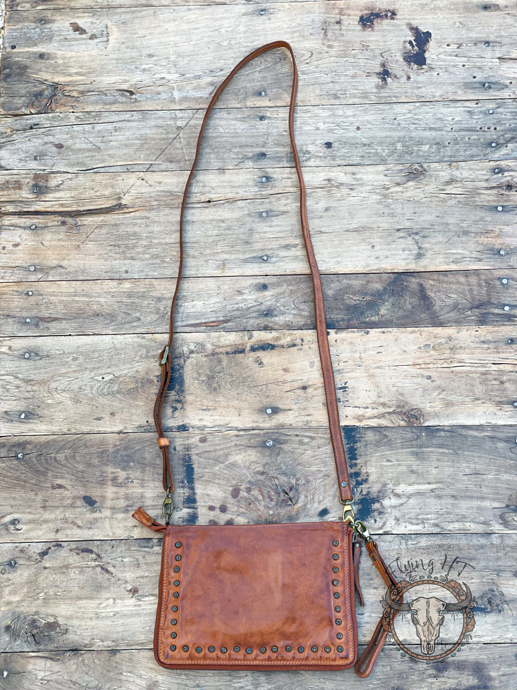 This luxury Waco Purse is made of a rich, soft brown leather with decorative brass rivets that offers sophistication and timeless style. A zip around closure ensures that all your belongings are safe and secure, while a wallet-style interior holds all of your valuables with ease. The adjustable and detachable crossbody strap lets you customize your look to suit any occasion.